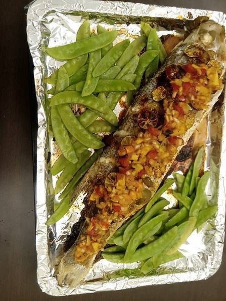 - 因為家裡有多的莎莎醬,都是耐烤食材,洋蔥跟番茄的組成,將他灑在魚上
