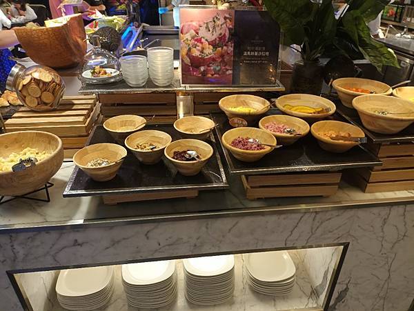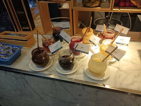 其他還有沙拉吧,馬鈴薯沙拉竟然有一個自己的區域很特別,麵包區域,麵包種類繁多,值得一提的是有非常多醬,蘋果醬吃的到顆粒酸甜好吃